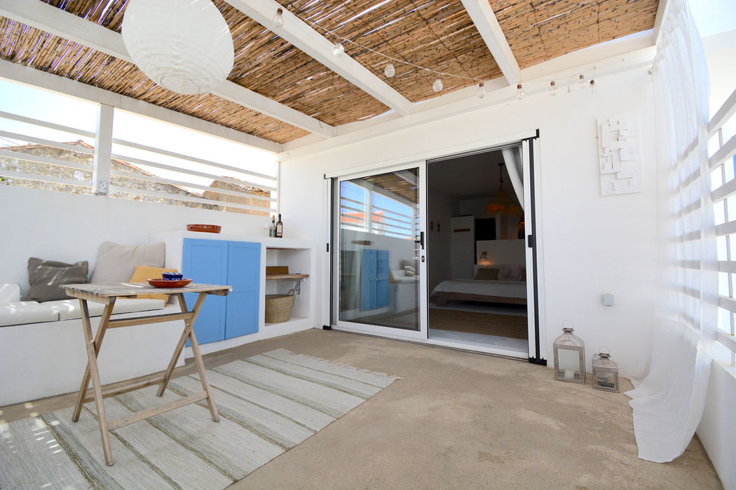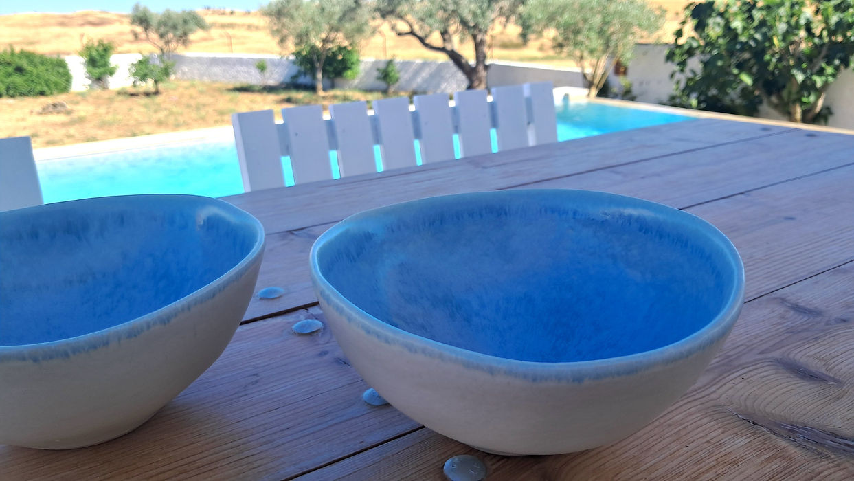 The pool area with a (honesty) bar, breakfast tables, double sunbeds and beautiful views. There is an extra terrace in the garden under the olive tree to enjoy.