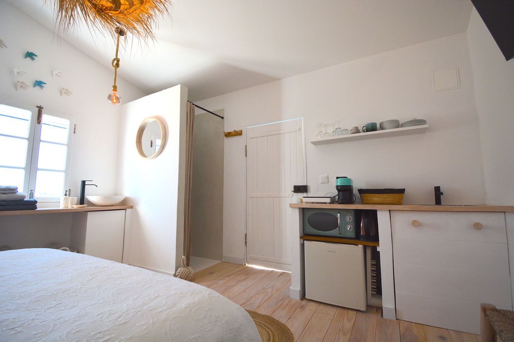 Fridge and kitchen areas with cooker (induction), microwave, kettle, Nespresso machine,...